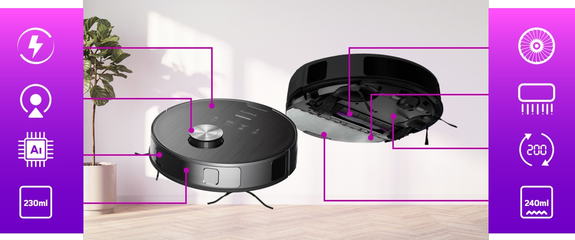 Recunoaste obstacolele folosind inteligenta artifi ciala (AI) Dotat cu un sistem bazat pe AI, robotul are o precizie milimetrica atat in curatenie, cat si in evitarea obstacolelor. Senzorii si algoritmul, precum si luminile laser 3D Cross-Line “citesc” mediul inconjurator si se adapteaza rapid acestuia. Astfel, niciun cotlon al casei nu este uitat. |