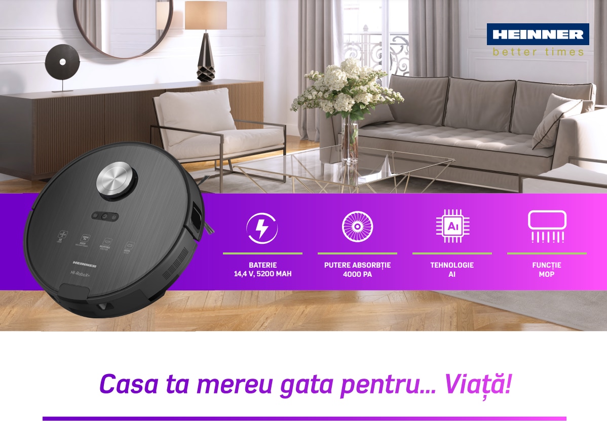 Robot de aspirare Heinner HI-RoboX+ HRVC-MAI52BK, WI-FI, aspirator si mop, 14.4V/ 5200 mAh, putere aspirare 4000Pa, motor BLDC, navigatie LDS, AI Technology, autonomie: 200 min, recipient praf:230 ml,rezervor apa: 240 ml, negru