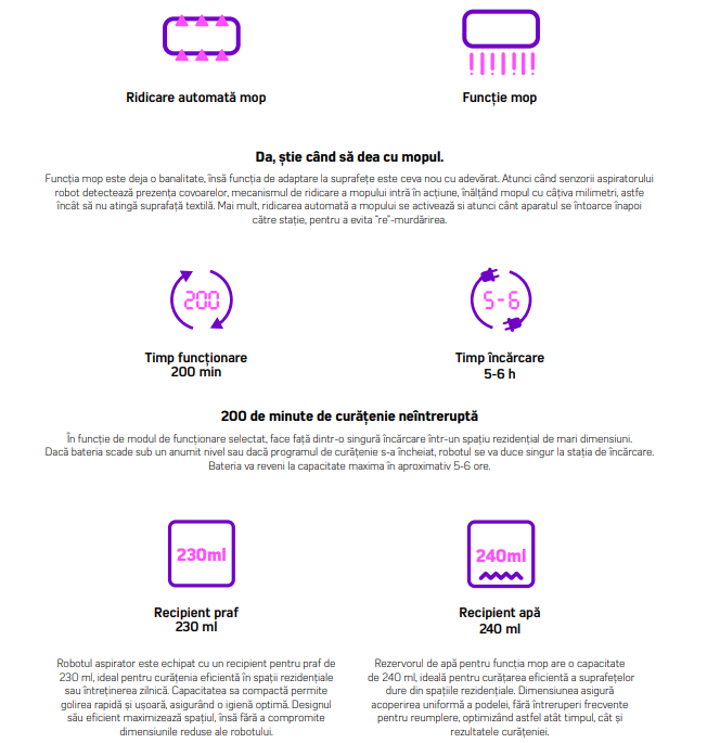 Curata mult si bine Capacitatea mare a bateriei, 5200mAh, permite utilizarea programelor puternice pentru mai mult timp si in spatii extra-generoase, in timp ce puterea de aspirare de 4000 Pa garanteaza absorbtia atat a particulelor minuscule de praf, cat si a fi rimiturilor, a parului de animale sau alte urme de murdarie. |