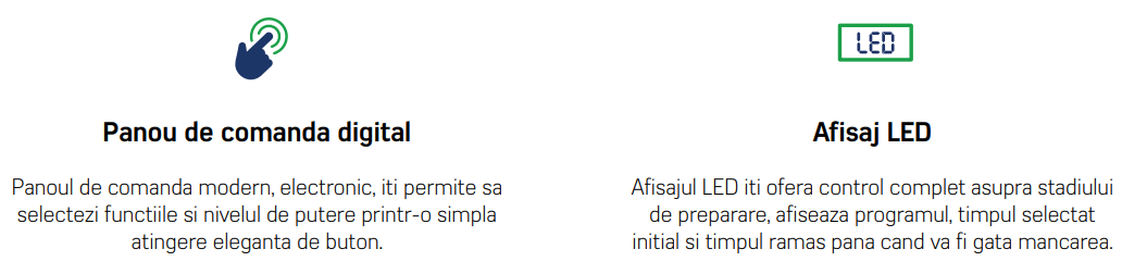 Functie AirFry Pentru ca mereu te gandesti cum sa optimizezi gatirea, dar crezi ca nu ai loc – cuptorul cu microunde are functie AirFry. Datorita gratarului care ajuta circulatia uniforma a aerului fierbinte si folosind o cantitate infima de ulei, te poti bucura de preparate crocante si gatite perfect. |