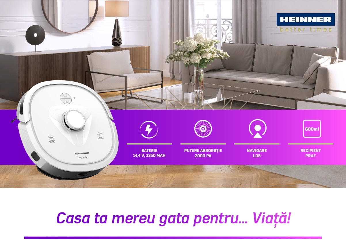 Robot de aspirare Heinner HI-Robo HRVC-M33WH, WI-FI, aspirator si mop, 14.4V/ 3350 mAh, putere aspirare 2000Pa, motor BLDC, navigatie LDS, autonomie 180 min, recipient praf: 600 ml, rezervor apa 250 ml, alb