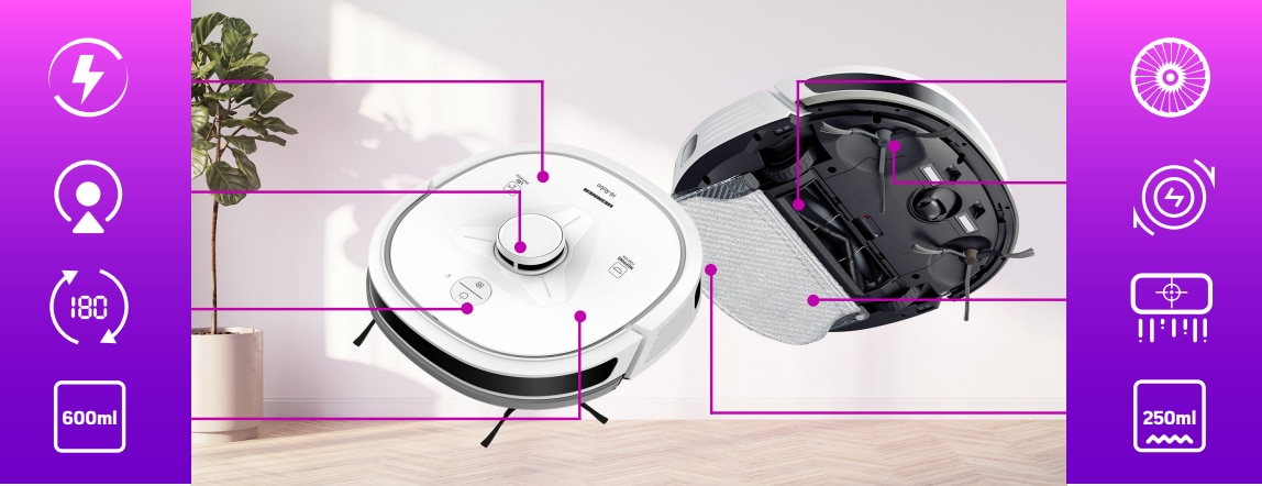 Curata mult si bine Capacitatea mare a bateriei, 3350mAh, permite utilizarea programelor puternice pentru mai mult timp si in spatii extra-generoase, in timp ce puterea de aspirare de 2000 Pa garanteaza absorbtia atat a particulelor minuscule de praf, cat si a firimiturilor, a parului de animale sau alte urme de murdarie. |
