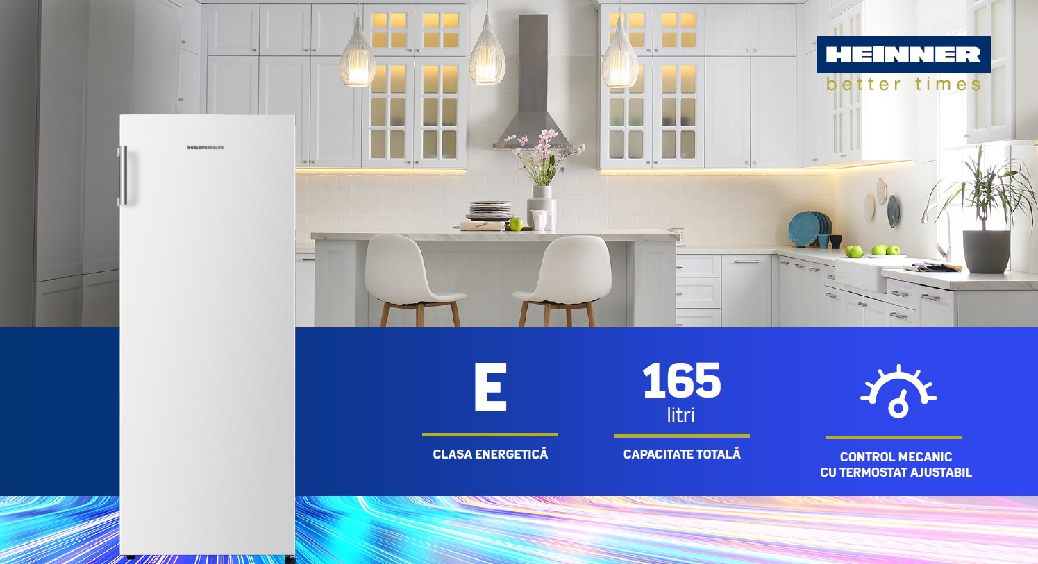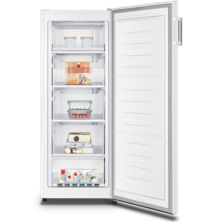 Congelator Heinner HFF-HS165E++, 165 l, Control mecanic cu termostat ajustabil, 5 compartimente - 4 sertare + 1 compartiment cu usa, H 143.4 cm, Clasa E, Alb