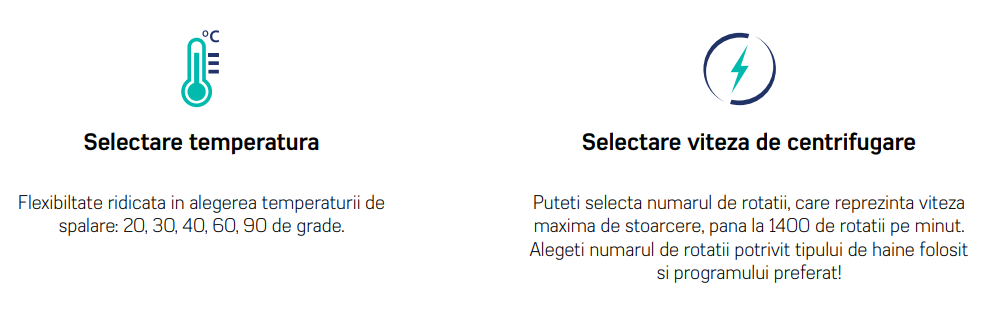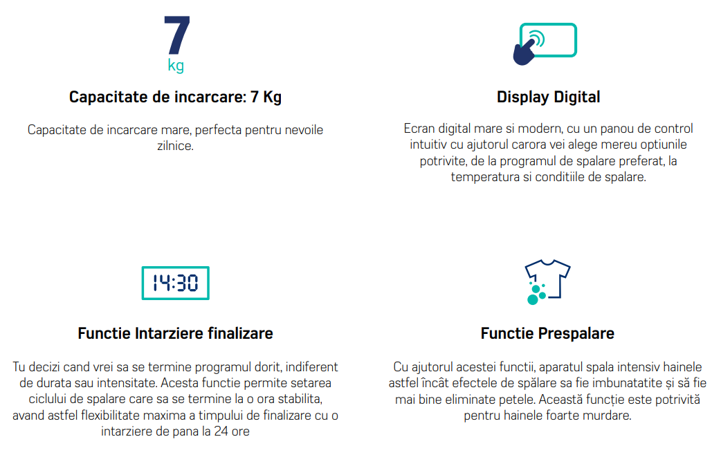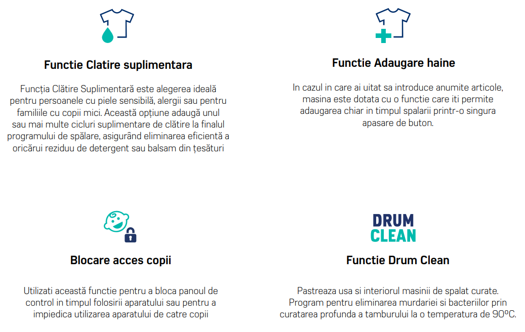 Functii : Clatire suplimentara Prespalare Selector viteza centrifugare Selector temperatura de spalare Intarziere finalizare Adaugare haine Add On Eliminare semnale acustice Igienizare cuva