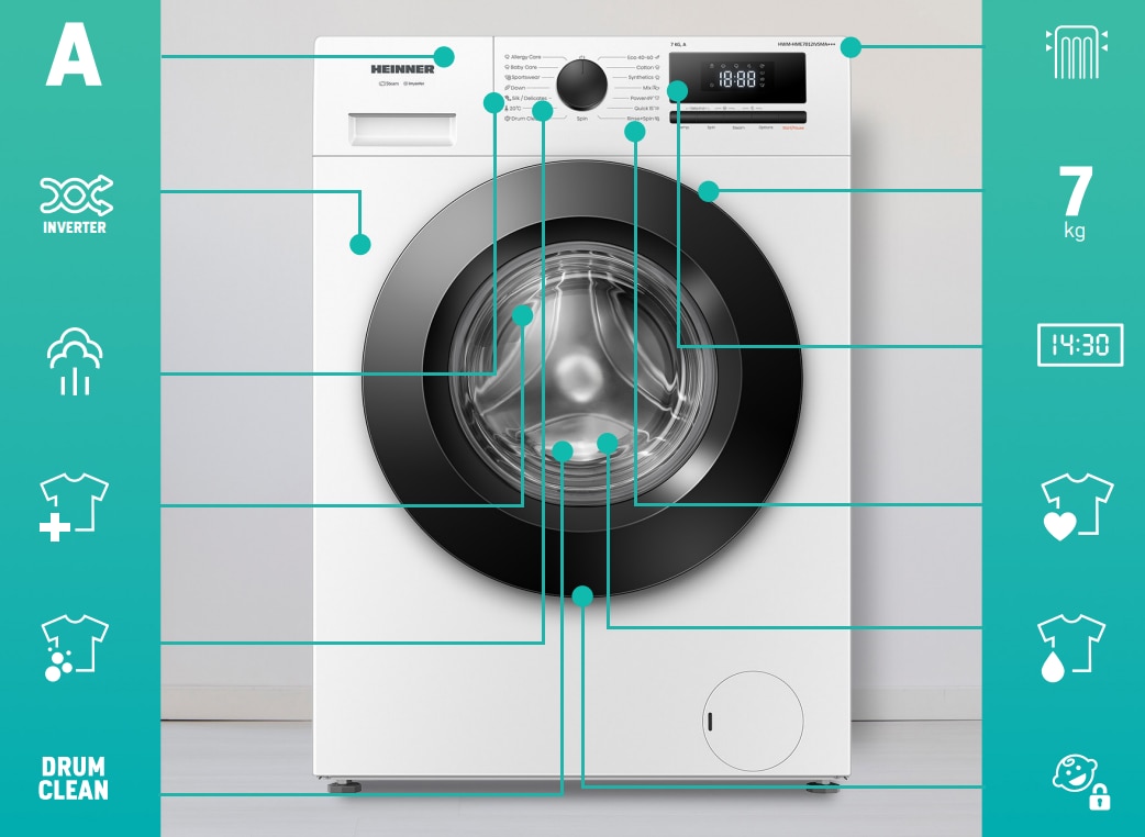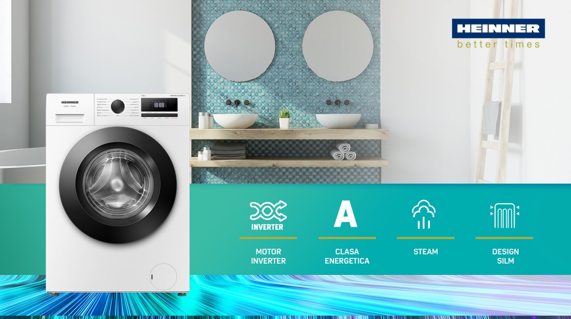 Masina de spalat rufe slim Heinner HWM-HME7012IVSMA+++, 7 kg, 1200 rpm, Clasa A, Motor inverter, 15 Programe, Display digital, Program allergy steam, Blocare acces copii, Alb