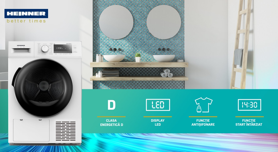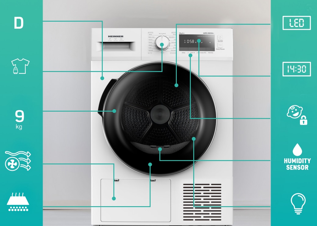 Uscator de rufe HEINNER HHPD-M9G3A++, Pompa de caldura, 9 kg, 14 programe, Clasa A++/D, Display LED, Lumina cuva, Indicator curatare filtru scame, Indicator rezervor colectare apa plin, Blocare acces copii, Alb