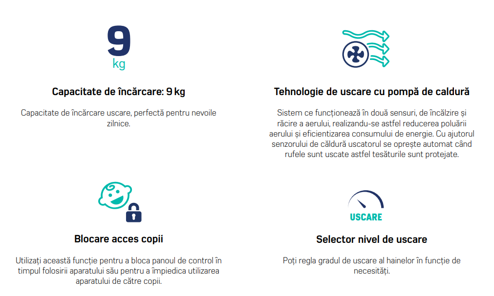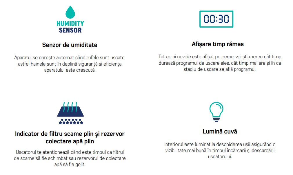 Functii : Iluminare Cuva Ajustare nivel uscare Afisare timp ramas Functie anti-sifonare Blocare acces copii Indicator curatare filtru scame Indicator rezervor colectare apa plin